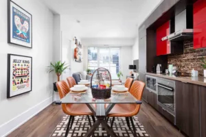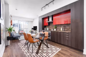 • Living Room & Kitchen – Open-concept layout with high-end European appliances.